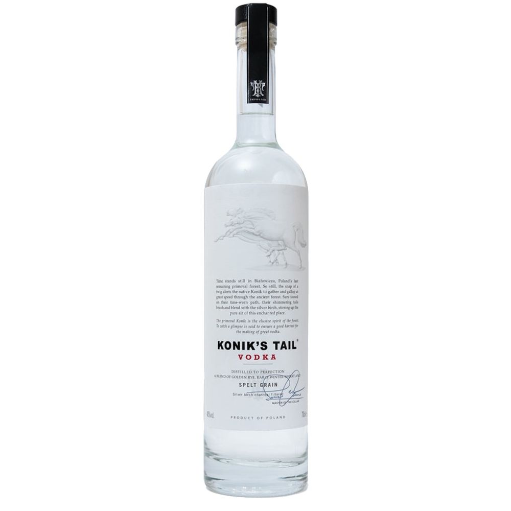 LA VODKA POLACCA – Konik’s Tail è una vodka artigianale creata dal barman Pleurat Shabani. Il nome si ispira a una razza di cavallo (Konik) originario della foresta di Bialowieza, tra Polonia e Bielorussia. Secondo la tradizione, riuscire a catturare lo sguardo di questo animale e` di buon auspicio per il raccolto e la produzione della vodka. I tre cavalli in etichetta rappresentano i tre cereali destinati alla distillazione: farro spelta, segale e grano. Dopo un’accurata selezione hanno luogo due distillazioni. Ogni bottiglia riporta la firma del mastro distillatore Bernadeta Ejsmont. È una vodka delicata in cui si percepiscono gli aromi del grano maturo, del farro, del pepe bianco, delle spezie e degli agrumi con un finale molto persistente.